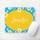 Nada traz luz do sol e felicidade como a Daisies branca e amarela. Este fofinho bonitinho apresenta flores de margarida abstrato e borboletas em um fundo azul turquesa brilhante. O mouse pad é personalizado com seu nome impresso em um círculo oval central amarelo de ouro brilhante. Os mouseads florais personalizados fazem presentes de excelente para você ou para o amante especial de flores em sua vida.