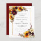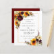 Os girassóis ouros, as rosas vermelhas escuras e as flores brancas de marfim são aninhadas nas folhas e bagas do outono. Eles decoram uma armação de ouro que rodeia os detalhes do seu chá de panela. A parte de trás do chá de panela é vermelho borrado. Este item coordena-se com a coleção Sunflower e Burgundy Wedding. Contém as modelos que você precisa para criar uma suíte de convites para casamento, placas de casamento e suprimentos de recepção também.