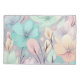 Esta design apresenta um fundo roxo leve com flores e folhas pastéis. As flores são cor rosa, azul e verde, enquanto as folhas são cor rosa, verde e laranja.