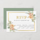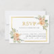 Pêssegos, flores a aquarela e molduras de ouro, cartão de resposta RSVP de casamento floral com opção de refeição. Este elegante design exibe uma moldura dourada e flores de cacto aqueira cor de pêssego e folhas suculentas nos cantos superior direito e inferior esquerdo e seu texto em ouro e preto.