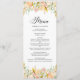Adicione brilho e brilho ao seu evento com este cartão de menu floral. Apresenta flores de cor aquosa de pêssego com folhas falsas de folha de ouro. O cartão de menu perfeito para casamentos de primavera, chás de panela, chás de fraldas e outros eventos.
