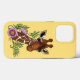 Retrato de uma girafa fofa contra um pano de fundo amarelo com flores cor-de-rosa.