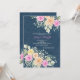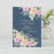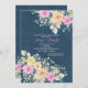Um convite floral com uma dica de "país". As flores cor-de-rosa e amarelas, a folhagem e a respiração do bebê estão agrupadas nos cantos superior e inferior, contra um fundo azul denim. <a href='http://www.freepik.com/free-vector/gorgeous-garden-party-invitation_852387.htm'>Concebido por Freepik</a>.