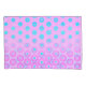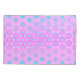 Este padrão colorido brilhante apresenta flores geométricas rosas, lilás e azuis-celestes num fundo lilás.