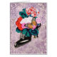 Uns calçados antigos das senhoras têm um buquê bonito dos gerânio, com uma borboleta empoleirada delicada nas flores. O fundo é uma cor da lavanda com uma cor damasco clara. A antiguidade, redemoinhos barrocos decora os lados.