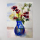 Esta impressão é de uma pintura de aquarela original em estilo impressionista. Flores vermelhas e amarelas dispostas em um vaso azul vívido. Em papel de poster de valor de qualidade.
