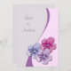 Este é um convite bonito do casamento da primavera ou do verão. O rosa, a lavanda e as flores azuis pastel com a jóia como centros decoram o direito mais baixo do convite, quando uma torção moderna for dada com as cinzas e a luz - cores cor-de-rosa do fundo separadas por uma beira curvada violeta. Os nomes dos noivos aparecem no texto cinzento no superior esquerdo. A parte traseira do convite está combinando cinzas, e é personalizada facilmente com seu texto do casamento. obrigados *Special a Lorene na diva de Digitas para o uso de seus trabalhos de arte neste design.*