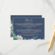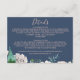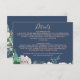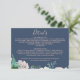 Este cartão de detalhes de casamento azul com flores românticas de peônia é perfeito para um casamento elegante. O design floral apresenta flores em tons de rosa claro, pêssego e branco em cascata em um fundo azul-marinho.