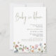 Um bebê neutro no tema Bloom convite para chás de fraldas. Este convite apresenta a manchete "Baby in bloom" em uma fonte verde verde e moderna, escrita à mão, e uma parte inferior de flores silvestres e borboletas aquáticas. O reverso apresenta um padrão de flores silvestres e borboletas. Personalize com seus detalhes.