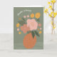 Este obrigado dobrado que você saúda a placa apresenta uma ilustração abstrato e moderna de flores cor-de-rosa e amarelas em um vaso de terracota sobre um fundo verde sábio. A frente lê simplesmente "obrigado um monte" e o dentro é vazio para versatilidade.