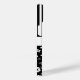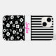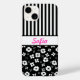 Esta capa de telefone bonito tem listras pretas e brancas na metade superior e flores brancas sobre um fundo preto correspondente na metade inferior. No meio está uma banda preta e branca como fundo do texto rosa atual, "Sofia". Altere o nome para seu próprio texto ou outro para personalizá-lo.