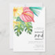 Simples convite para o casamento de flores tropicais. Seus nomes se destacam em uma bela tipografia com uma grande escrita e... As flores tropicais de aquarelas, incluindo o hisco e as folhas de palma, tornam esta opção tão bonito. Ver pontos coordenadores no nosso compro.
