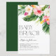 Convide os convidados para o seu evento com este convite personalizável de papelaria de brunch bebê. Apresenta ilustrações a aquarelas de folhas de palma, folhas de bananas, hibisco, plumeria e outras plantas tropicais. Personalize este convite para o bebê tropical adicionando nome, hora, data e outros detalhes do evento. Este convite para o bebê verde é perfeito para chás de fraldas de verão.