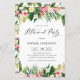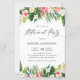 Celebre o seu próximo pacote de alegria com este belamente personalizável convite de festas de aposentadoria apresentando um tema tropical vibrante. Com planície aquosa de plumeria, hibisco e outras flores exóticas, esta carta elegante é enquadrada por verde tropical, incluindo folhas de palma e folhas de bananeira. É perfeito para uma aposentadoria de verão, uma festa de luau, ou qualquer celebração inspirada na ilha. Este convite para a festa de aposentadoria tropical é fácil de personalizar com seus detalhes de evento.