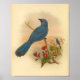 Ilustração vintage de 1880 do Pássaro Shrike Azul Cuckoo. Com penas azuis sentadas em um galho de árvore com flores vermelhas.