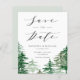 Anuncie sua data de casamento com este cartão fixo de data. Apresenta árvores aquarelas, roteiro elegante e tipografia simples. Personalize esta floresta para salvar o anúncio de data adicionando seus detalhes de casamento. Este bosque salva o cartão de data é perfeito para casamentos e casamentos no inverno de primavera.