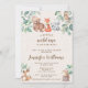 Tema de floresta bonitinho em aquarela, animais florestais com padrão de madeira, convite para chá de bebês. Raposa, urso, dono, ouriço, guaxinim e veado com folhas e mensagem: um pouco selvagem está a caminho.
