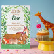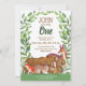 Celebre o seu primeiro aniversário com este encantador convite para a floresta! Possui animais de floresta aquosa como raposa, urso, coelho e esquilo, com folhas verdes e texto rústico. Perfeito para festas ao ar livre ou inspiradas na natureza. Personalize com seus detalhes!