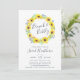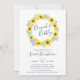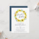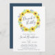 Os convites para brunch de chá de panela chic do país apresentam uma coroa de girassóis de cor d'água, folhas verdes e minúsculos botões azuis marinhos, cercando "brunch & bubble" em letra chic manuscrita. Personalize com os detalhes do seu chá de panela.