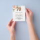 Por favor, note que este convite está no papel de folheto e é muito fino. Os envelopes não estão incluídos. Para convites mais espessos (mesmo design) visite nossa loja. Um convite elegante para uma festa de aniversário 70. Um fundo branco chic. Decorados com um rosa de ouro e rosa cor-de-rosa-esbranquiçada, folhas de eucalipto florais, verdes, galhos, verde e borras de ouro. Personalize e o nome e os detalhes da festa. Letras pretas e ouros. O nome é escrito com um moderno estilo escrito à mão. O número 70 é escrito com uma fonte no estilo do balão de ouro. Traseira: cor de fundo rosa dourada.