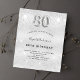 Por favor, note que este convite está no papel de folheto e é muito fino. Os envelopes não estão incluídos. Para convites mais espessos (mesmo design) visite nossa loja. Um convite moderno, na moda e glamouroso para uma festa de aniversário 80. Um fundo com aparência de prata falsa, decorado com poeira brilhante. Personalize e adicione o seu nome e detalhes da festa. O número 80 é escrito com uma fonte de estilo balão, script.