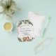 Por favor, note que este convite está no papel de folheto e é muito fino. Os envelopes não estão incluídos. Para convites mais espessos (mesmo design) visite nossa loja. Para uma festa de aniversário 90. Um fundo branco decorado com verde de eucalipto e folhas de ouro. Pontos de brilho falsos do ouro. Personalize e adicione seus nomes e detalhes do casamento. Letras pretas e ouros coloridas. O número 90 é escrito com a fonte do estilo do balão. Traseira: fundo branco e pontos brilhantes de falso ouro.