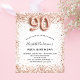 Por favor, note que este convite está no papel de folheto e é muito fino. Os envelopes não estão incluídos. Para convites mais espessos (mesmo design) visite nossa loja. Para um 90 elegante aniversário. Um fundo branco. Decorado com rosa dourado, cintilação falsa rosa, faíscas. Personalize e adicione um nome e detalhes da festa. O nome é escrito com um script de estilo manuscrito, número 90 com fontes de estilo de balão.