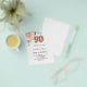 Por favor, note que este convite está no papel de folheto e é muito fino. Os envelopes não estão incluídos. Para convites mais espessos (mesmo design) visite nossa loja. Um convite elegante para uma festa de aniversário 90. Um fundo branco chic. Decorados com um rosa de ouro e rosa cor-de-rosa-esbranquiçada, folhas de eucalipto florais, verdes, galhos, verde e borras de ouro. Personalize e o nome e os detalhes da festa. Letras pretas e ouros. O nome é escrito com um moderno estilo escrito à mão. O número 90 é gravado com uma fonte no estilo do balão de ouro.