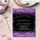 Por favor, note que este convite está no papel de folheto e é muito fino. Os envelopes não estão incluídos. Para convites mais espessos (mesmo design) visite nossa loja. Um convite moderno, na moda e glamouroso para uma festa de aniversário de 21 ruas (ou qualquer idade). Um fundo preto com poeira brilhante púrpura. O nome é escrito com um moderno estilo escrito à mão. Personalize e adicione os detalhes da sua festa.