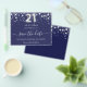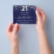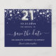Um 'Save the Date' feminino e moderno para uma festa de aniversário de 21 anos. Um fundo azul marinho. Decorado com estrelas prateadas falsas. O texto: 'Save the Date' é escrito com um estilo de letra manuscrita grande e moderno. O número 21 é escrito com uma fonte estilo balão.