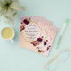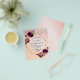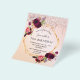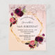 Por favor, note que este convite está no papel de folheto e é muito fino. Os envelopes não estão incluídos. Para convites mais espessos (mesmo design) visite nossa loja. Na frente: Um convite para uma festa de aniversário de 50 anos, 50 (ou qualquer idade). Um rosa dourado, fundo branco cor-de-rosa cor-de-rosa com uma falso estrutura geométrica dourada. Decorados com flores roxas escuras e burgueiras, rosas e penas do estilo "boho". Derramamento de ouro rosa. Modelos para um nome e detalhes da festa. O nome é escrito com um script de estilo manuscrito, letras coloridas de cinza. Traseira: Rosa dourado, fundo cor-de-rosa-rosa-claro.