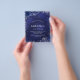Por favor, note que este convite está no papel de folheto e é muito fino. Os envelopes não estão incluídos. Para convites mais espessos (mesmo design) visite nossa loja. Um fundo azul marinho, decorado com falso brilho prateado, faíscas e flores azuis. A cor azul é irregular. Personalize e adicione um nome e detalhes da parte.
