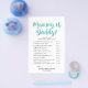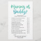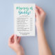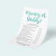 Este jogo de "baby babble" da caligrafia aquática é perfeito para um chá de fraldas de meninos de verão. A frente do cartão de jogo apresenta "mamãe ou pai?", e a parte traseira do cartão contém "baby babble". O design de diversão e enérgico apresenta um bonito verde-lacrimogêneo e uma fonte de script de cores aqua azul-ombre. Personalize a frente do cartão com o nome da futura mãe e a data do chá de fraldas. Você pode personalizar as perguntas do jogo clicando no botão "personalizar". CHAVE DE RESPOSTA BABY SCRAMBLE: 1.Fralda 2.Bassinet 3.Frasco 4.Crib 5.Pacificador 6.Mesa alterada 7.Animal empilhado 8.Rolha 9.Pato de borracha 10.Banheira 11.Teado 12.Fórmula 13.Cadeira alta 14.Térmico 15.Termômetro