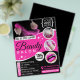 Essa modelo é a solução ideal para salões de beleza e indivíduos que buscam promover seus serviços de salão com um toque de elegância e sofisticação. O design é totalmente personalizável e editável, permitindo que você o adapte às suas necessidades e preferências específicas. O design apresenta um esquema de cores cativante, combinando tons de rosa e preto, que exaltam uma sensação de glamour, estilo e atração. Este folheto tem como objetivo evocar um sentimento de luxo e profissionalismo, incentivando potenciais clientes a se submeterem a tratamentos excepcionais de beleza.