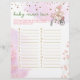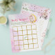 Flores, cor-de-água rosa, belos coelhos e corações com brilho dourado. Dois jogos para um chá de fraldas: bingo de bebê, e corrida de nomes de bebês.