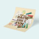 Uma colagem de papel manchado, fotos, fitas de múltiplas formas e cores, fotos verdes e vermelhos de estrelas e uma forma de nuvem branca recortada. Tipografia castanha, Bem-vindos À Escola De Volta É Divertido. fundo abstrato beige.