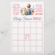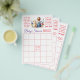 Uma menina bonita e um filhote de cachorro do White Lab temem o cartão de chá de fraldas Bingo de um lado e o outro tem o jogo "Quem conhece melhor a Mamãe".