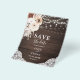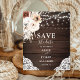 Orçamento Boho Chic Casamento Salve a data Flyer apresenta flores neutras com grama pampa e luzes de cordas em madeira.