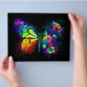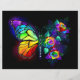Arco-íris, borboleta monarca luminosa, pintada artisticamente com buquê de rosas iridescentes, brilhantes e luminescentes sobre fundo preto. Borboleta-arco-íris.