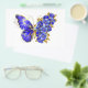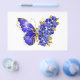 Borboleta de flores cinza, azul, safira, espumante com asa decorada com flores preciosos azuis com folhas de ouro sobre fundo branco.
