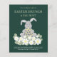 Caça de ovos Coelhinhos da Páscoa e convite para apresentação de orçamento, com um adorável coelho primavera, segurando um ovo de Páscoa amarelo e roxo rodeado por folhagem floral e eucalipto margarida em um fundo verde esmeralda. Modelos de script de tipografia manuscritos para todos os detalhes da sua divertida festa de primavera. Arte original da artista Catherine Sweetman