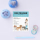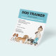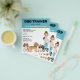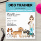 Projetado com treinadores de cães e compositores de animais de estimação em mente, apresentando a ilustração original de Destei de uma garota de cartoon feliz, juntamente com quatro cachorros, incluindo um blenheim Cavalier King Charles Spaniel, miniatura de damasco Goldendoodle, um buldogue francês famoso e um cabelo preto e liso Dachshund. A menina está vestindo jeans azuis e uma camiseta branca. Seu cabelo comprido e marrom é colocado em um rabo de cavalo e ela tem uma amistosa expressão de rosto sorridente. O design tem várias áreas de texto personalizáveis para informações de negócios e detalhes. Captura de olhos e design fofo para promover a sua empresa relacionada a cães com o trabalho de arte único de Destei.