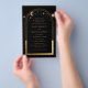 Orçamento Místico Negro Dourado Sol Lua Sol Astronomia Foto Convites de Casamento Apresenta Sol dourado, Lua e estrelas com um quadro de ouro sobre fundo negro. Dentro é a sua informação de convite de casamento. Personalize editando o texto nas caixas de texto e adicionando sua foto favorita no verso. Projetado para você por ©Evco Studio www.zazzle.com/store/evcostudio