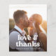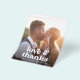 Este é um cartões de agradecimentos de casamento boêmico de orçamento usando um tipo de letra retrô vintage junto com um design de foto moderno e simples, impresso em um folheto de papel. O verso inclui uma segunda fotografia e uma obrigado que você pode personalizar. Altere facilmente as cores, o texto e as fotos, conforme necessário. Entre em contato com o designer para obter informações relacionadas a este design.