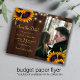 Barato Elegante de verão chic ou na moda casamento outono BUDGET salva a data PAPER FLYER modelo em madeira de celeiro marrom apresentando belos buquês de girassol, cordas ou luzes cintilantes, e um roteiro de caligrafia em ouro. +++++++++++++++ Fácil de personalizar com seus detalhes e foto! ++++++++++ Adequado para elegantes períodos de Verão ou outono no rusticidade do país ao ar livre ou casamentos de celeiro. +++++++++++++++++++++++++++ LEIA ISTO ANTES DE COMPRAR! Este é um cartão de barato de orçamento impresso em um FLYER. +++ Observe que o PAPEL ORÇAMENTAL É THIN - Você pode fazer upgrade para que este cartão seja impresso no estoque de cartão +++ ENVELOPES NÃO INCLUÍDO. +++ Verifique todas as informações e ortografia do seu texto porque você receberá exatamente o que você vê - ninguém mais verificará nada antes de imprimir. +++ Esta placa foi projetada para o tamanho de 4,5" x 5,6". Caso você escolha outro tamanho do cartão e o texto saia da página, tudo precisa ser corrigido antes de adicionar o produto ao carrinho. Peça ajuda ao Serviço de Design ao Vivo.
