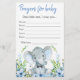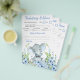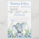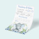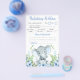Jogos de chá de bebê de elefante menino com adorável elefante bebê com gravata borboleta em um fundo verde de flores azuis. Esses panfletos de jogos de chá de bebê de elefante menino são de dupla face com dois jogos diferentes.
