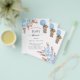 Por favor, note que este convite está no papel de folheto e é muito fino. Os envelopes não estão incluídos. Para convites mais espessos (mesmo design) visite nossa loja. Para um chá de fraldas moderno estilo boho. Fundo branco. Decorado com flores azuis-claras, rosas, grama-pampas e um ursinho-peluche segurando um balão azul. Personalize e adicione um nome e detalhes da parte.