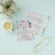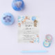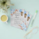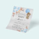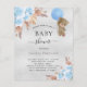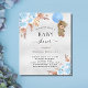 Por favor, note que este convite está no papel de folheto e é muito fino. Os envelopes não estão incluídos. Para convites mais espessos (mesmo design) visite nossa loja. Para um chá de fraldas moderno estilo boho. Um fundo de olhar mal prateado. Decorado com rosas azuis-claros, grama-pampas e um ursinho-peluche segurando um balão azul. Personalize e adicione um nome e detalhes da parte.