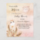 Por favor, note que este convite está no papel de folheto e é muito fino. Os envelopes não estão incluídos. Para convites mais espessos (mesmo design) visite nossa loja. Para um chá de fraldas moderno estilo boho. Um fundo rosa dourado, rosado, rosado e roxo, com aspecto metálico. Decorado com um bebê girafa fofo, grama de pampas e uma lua sorridente feliz. Personalize e adicione um nome e detalhes da parte.