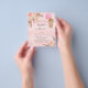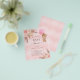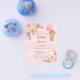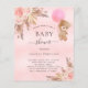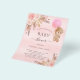 Por favor, note que este convite está no papel de folheto e é muito fino. Os envelopes não estão incluídos. Para convites mais espessos (mesmo design) visite nossa loja. Para um chá de fraldas moderno estilo boho. Um plano de fundo metálico de gradiente cor-de-rosa-claro. Decorado com ouro rosa e flores cor-de-rosa, rosas, grama-pampas e ursinha-peluche segurando um balão rosa. Personalize e adicione um nome e detalhes da parte.